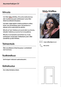 Asunnonhakijan CV:n voi liittää asuntohakemusten liitteeksi tai antaa esimerkiksi asuntonäytöllä asunnon esittelijälle. Asunnonhakijan CV:n ohjeistusta voi käyttää myös apuna asuntohakemusten laatimisessa.